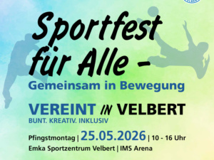 Pressemitteilung vom 25.03.2026 Velbert ist am Pfingstmontag, 25. Mai, ein Ort für Bewegung, Begegnung und Spaß: Von 10 bis 16 Uhr laden das EMKA-Sportzentrum und die IMS Arena (Bahnhofstraße 116) zum inklusiven...